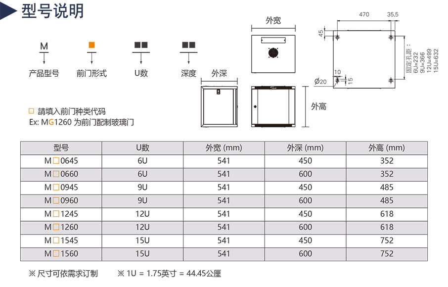 M系列19”墻柜是依據(jù)ANSI/EIA RS-310-D、IEC297-2以及DIN41491標(biāo)準(zhǔn),采用焊接式設(shè)計(jì)讓整體結(jié)構(gòu)穩(wěn)固,材質(zhì)為高有質(zhì)冷軋鋼板,承重可達(dá)80公斤,高度可依需求有6U、9U、12U、15U可供選擇。